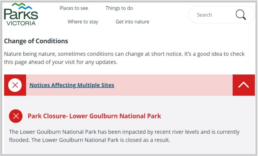 Because of rising water levels in the Goulburn River, ParksVic have closed both the National Parks that the Yellowelly Track passes through between Murchison and Echuca. See the links below.