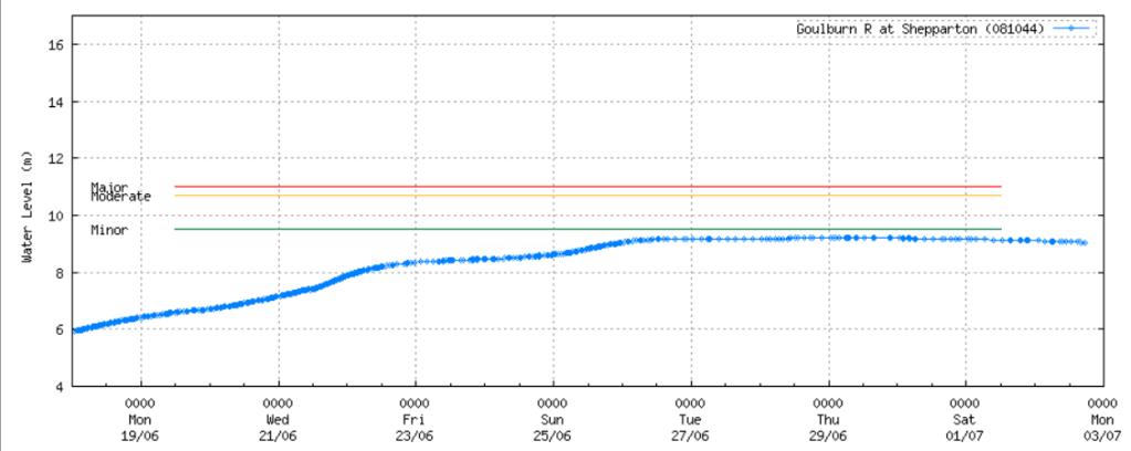 This is a bit of a surprise because there are no current flood warnings for the area around Shepparton. The National Parks and Yellowbelly Track are on low-lying flood plain which is impacted as soon as water comes over the river bank. This happens at a lower water level than the minor flood level. See the graph below (source) –