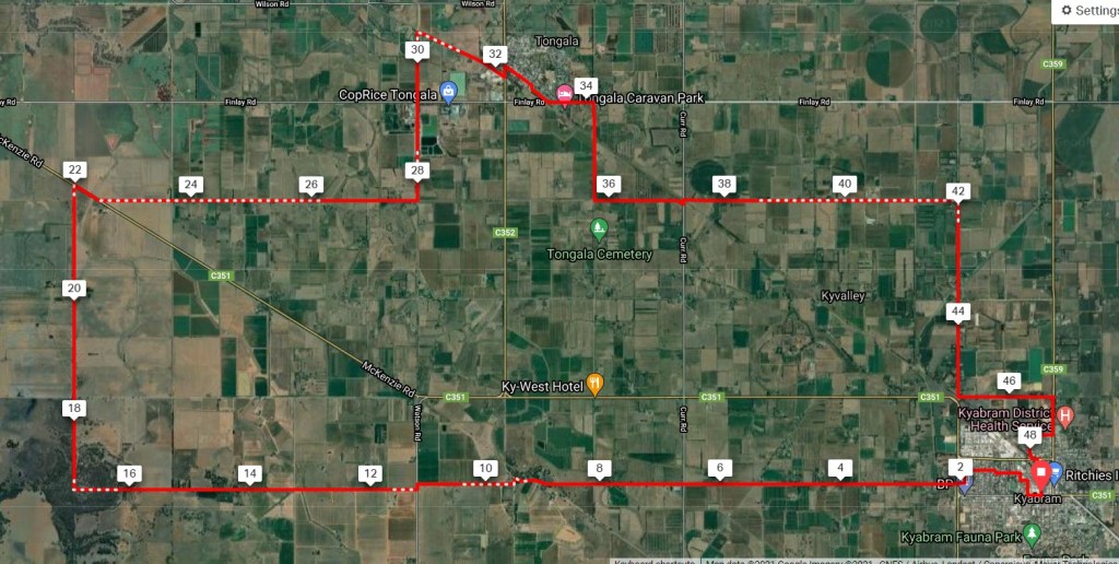 - Suggested Ride: Start at Kyabram and ride clockwise. Visit the donkeys, then lunch at Tongala pub, before return to Kyabram.