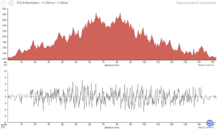 - Terrain: There are no major climbs. The route rises about 160m and then descends. However it is rolling – there are lots of short uphill sections along the route. Total vertical metres = 1,184 m.