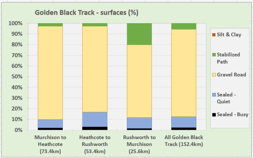 - Ride surfaces: 6% stabilized path, 82% gravel, 10% quiet sealed roads, 2% busy sealed roads.