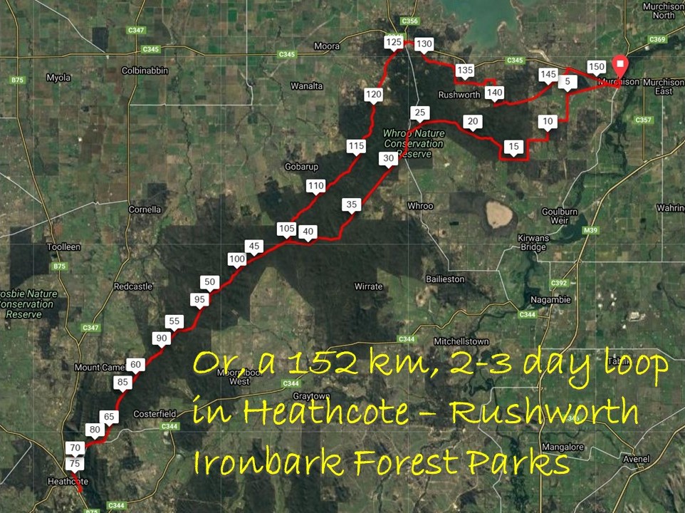 If you are planning to do a 152 km overnight loop, my suggestion is to start at Murchison and do the longest continuous leg, with the most climbing, on the first day. Then overnight in or near Heathcote. The next day, although longer in total, will have more downhill and the opportunity for a rest/meal break at the very scenic town of Rushworth on the way back.