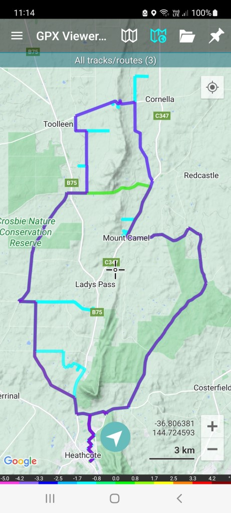 - App: GPX Viewer. The free version is very usable – I would pay for this if it was not free. I’ve paid the one-off-fee (<$10) to upgrade to the pro version because it gives me a background map when I am offline, and also the ability to record my own breadcrumb track as I ride.