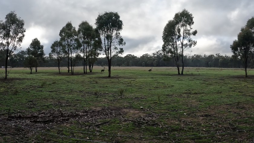 The gravel started only around the corner from our accommodation, so we felt quickly on our way into the quiet country roads of the day. Not far along the first road, the ironbark trees of Rushworth State Forest began, and we saw our first kangaroo! Another turn and we were heading past a farm with HUGE emus, 2 of them racing along the paddock beside us, curious about what these strange beings on wheels were.