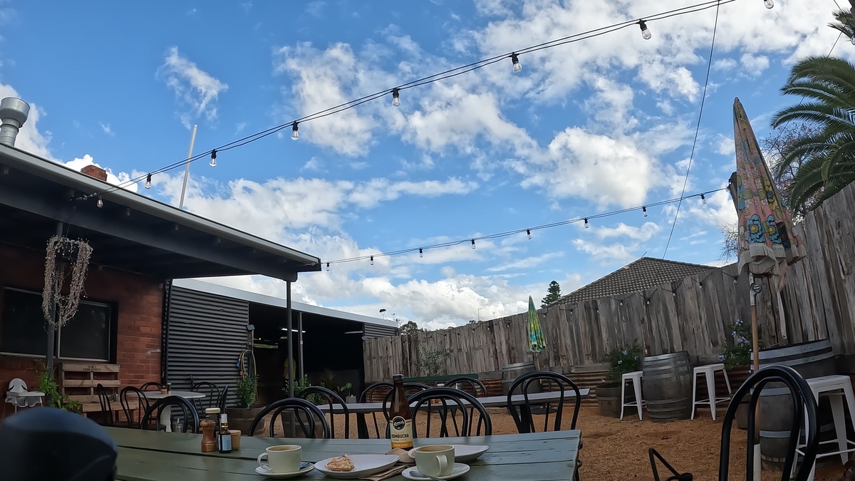 Before we knew it, we hit Tatura, and hadn’t seen a single car until we were on the edge of it. It had just started to spit, and it was perfect timing for grabbing a warming cup of coffee and find somewhere dry to eat the leftover lunch we had brought with us.