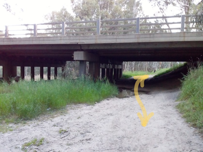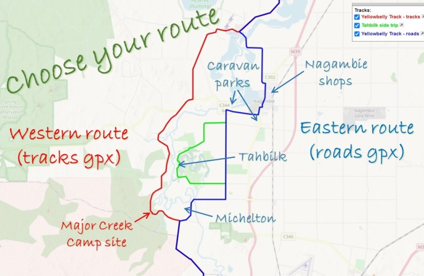 The Yellowbelly Track splits at the western end of Kirwans Bridge as shown in the map below. Riders have to make a choice: