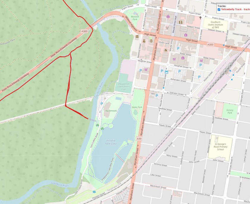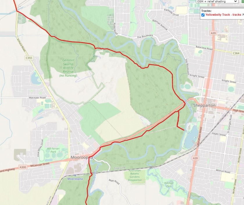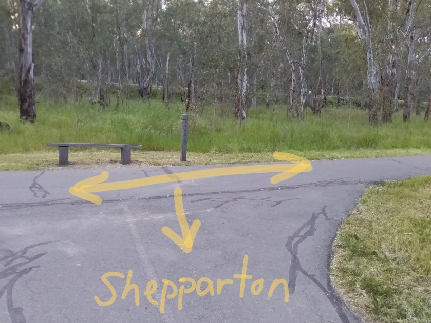 The first thing to understand about riding through Shepparton / Mooroopna is that “if you blink, you might miss it” – which is extraordinary for a city of 55,000 people. The Yellowbelly Track route follows a flood plain next to the river, right through a gap in middle of the city (see slideshow below which explains access).