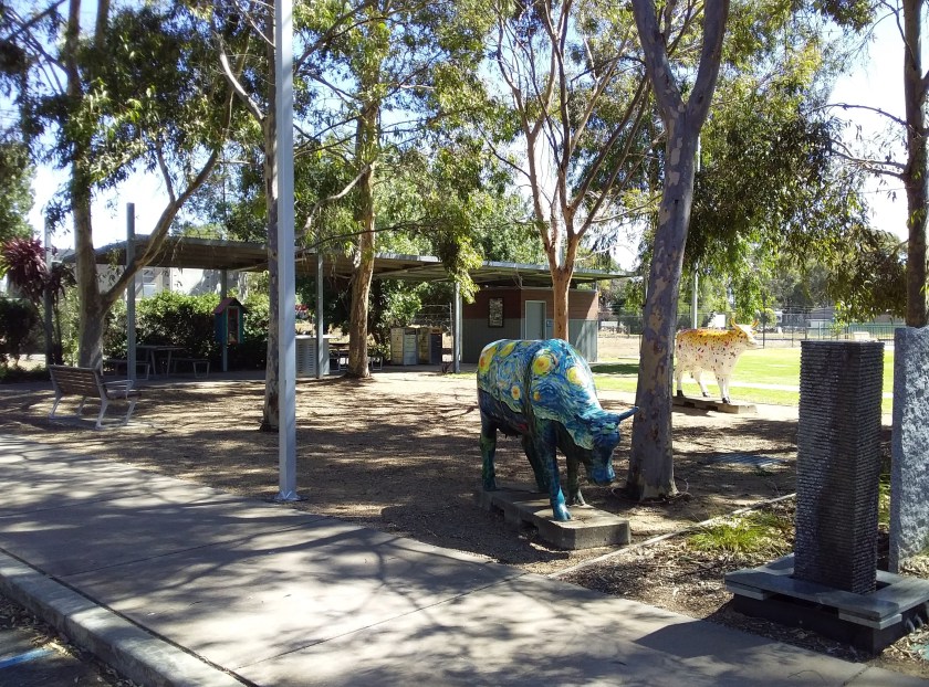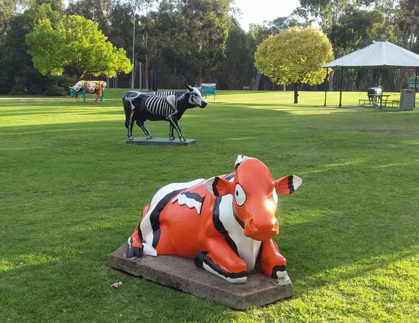 If you haven’t worked it out, painted fibreglass cows are a thing in the Greater Shepparton LGA. You will see them in municipal locations in towns throughout that LGA. As a concept this is amusing enough, but each of the cows has a name and a backstory, and they get moved around to different locations. It’s almost like someone had a plan to entertain passing cyclists.