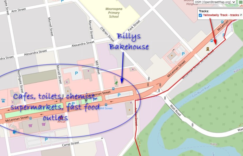 The Yellowbelly Track passes by the edge of Mooroopna’s 500 metre retail strip (see map below).