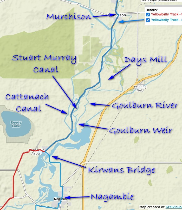 Stuart Murray and Cattanach Canals. In this segment, most of the flowing water you see alongside the road is not the Goulburn River. Instead the road weaves between, and over, two large Canals carrying water north for irrigation (as shown in map below). Built around 1890 these Canals enabled a boom in agrictultural development and population growth in northern Victoria.
