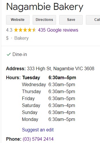 Nagambie Bakery is on northern end of the shopping strip. This bakery changed hands last year and does not have a website. See details in pic to the right.
