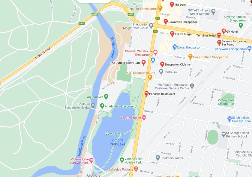 - If you are riding through and just want a meal or supplies – Mooroopna on Western side is the better option, as it has cafes, shops and supermarkets closer to the route.