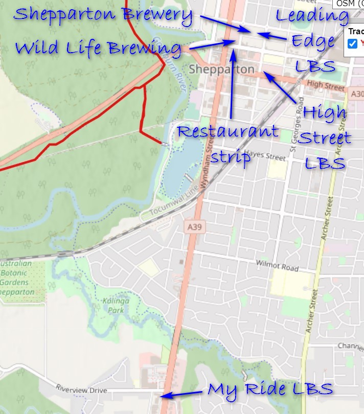 Next level up the bikepackers’ need hierarchy, Shepparton also has 3 bike shops, 2 craft breweries, and a restaurant strip (as shown in the map below).