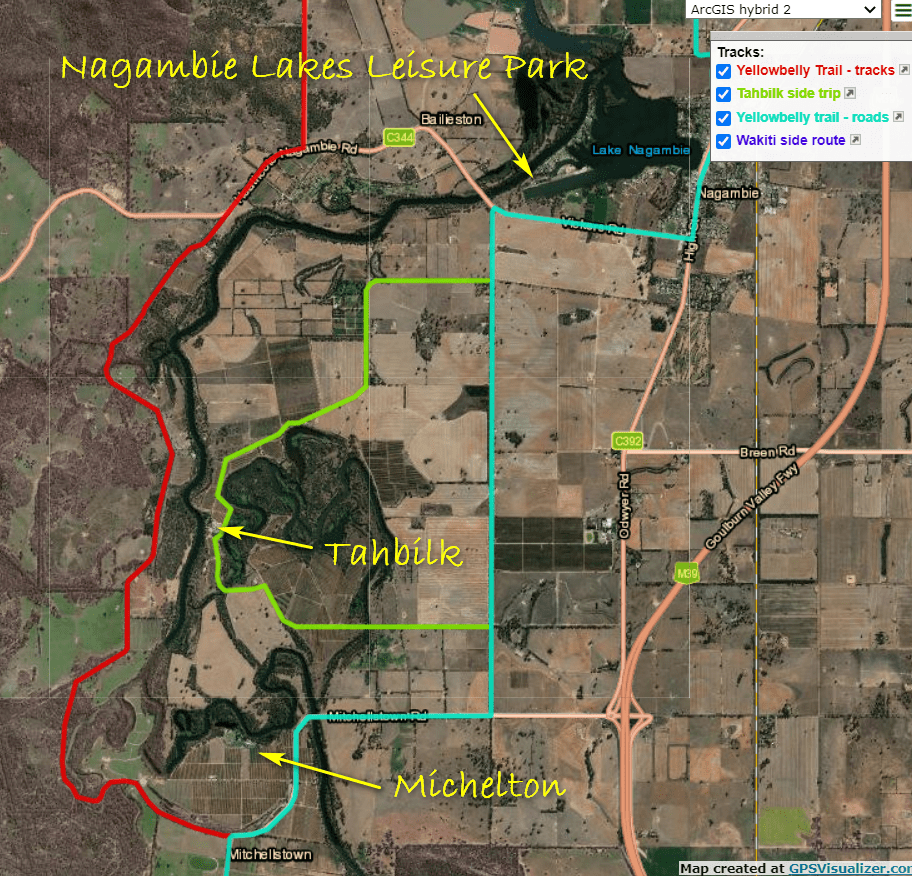 You may also need this gpx file from Echuca to Wakiti Creek Resort, as there are not many signs and you won’t see them in the dark.