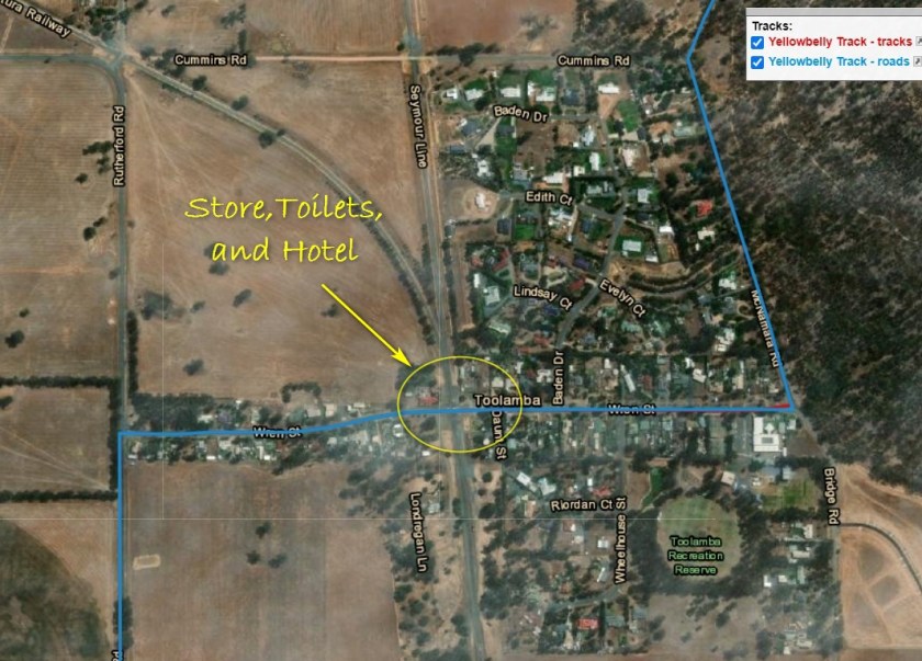 Toolamba is a very small town but is a useful break location for passing riders. The only facitilites – store/cafe, toilets and a pub are all clustered in the centre of the town where the main street crosses the railway line.